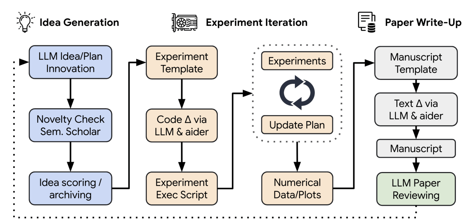 Infine, nella fase di stesura dell’articolo, il sistema produce paper scientifici in LaTeX, sezione per sezione, utilizzando le note registrate e i grafici generati. Include anche ricerche bibliografiche e revisioni del manoscritto, simulando l’intero processo di pubblicazione accademica.