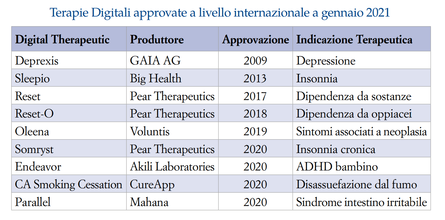 Terapie digitali approvate nel mondo (fonte: Tendenze Nuove – n.1/2021)