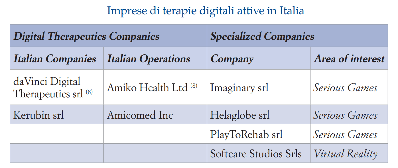 Per approfondimenti sulle terapie digitali si suggerisce la lettura del documento “Terapie digitali: un’opportunità per l’Italia”, di cui chi scrive è coautore.