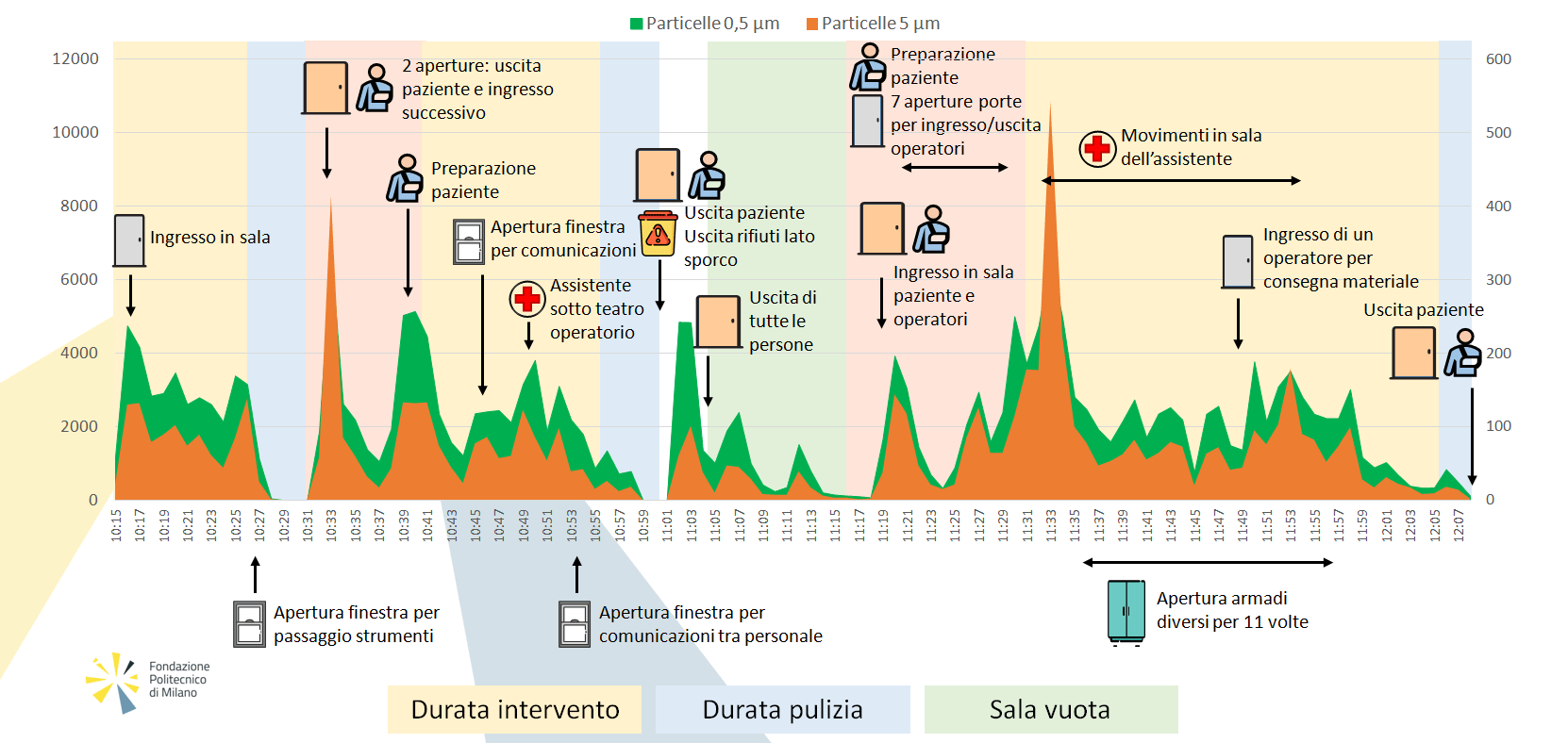 Le particelle aeree cariche di batteri, infatti, possono depositarsi sugli strumenti chirurgici o penetrare direttamente nel sito chirurgico, dando luogo ad infezioni. Nondimeno, il comportamento degli operatori è cruciale sia in relazione a fattori di rischio, come igiene delle mani e sterilizzazione degli strumenti chirurgici non appropriate, sia perché azioni svolte dagli operatori, quali l’apertura delle porte, la preparazione del tavolo degli strumenti e la vestizione, comportano un incremento di particelle nel sito operatorio.